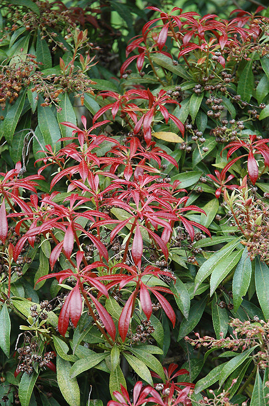 Valley Valentine Japanese Pieris features dainty chains of red bell-shaped flowers hanging below the branches in early spring. It has attractive dark green evergreen foliage which emerges brick red in spring. The glossy narrow leaves are highly ornamental and remain dark green throughout the winter.