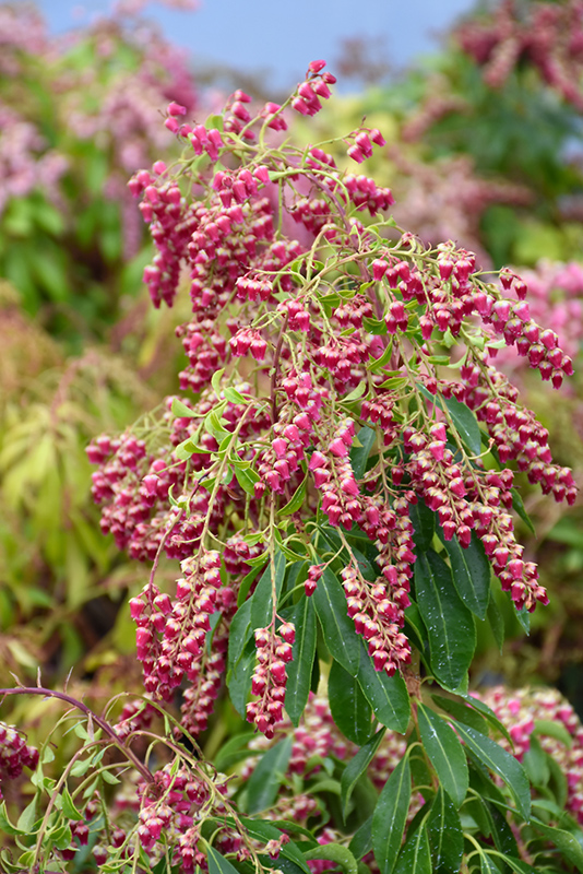 A breathtaking broadleaf evergreen shrub which bears delicate and showy chains of deep pink bell-shaped flowers and colorful emerging foliage, a dense and upright cultivar; performs best in moist, organic and acidic soils