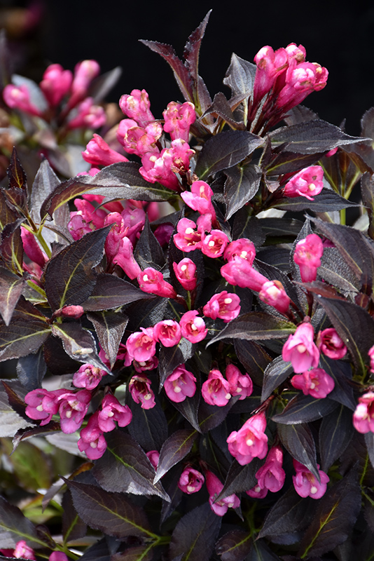 Spilled Wine® Weigela features showy clusters of hot pink trumpet-shaped flowers with buttery yellow anthers along the branches from late spring to early summer. It has attractive dark red deciduous foliage. The pointy leaves are highly ornamental and turn an outstanding burgundy in the fall.