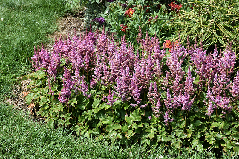Visions Astilbe will grow to be about 12 inches tall at maturity extending to 18 inches tall with the flowers, with a spread of 18 inches. When grown in masses or used as a bedding plant, individual plants should be spaced approximately 14 inches apart. Its foliage tends to remain dense right to the ground, not requiring facer plants in front. It grows at a medium rate, and under ideal conditions can be expected to live for approximately 10 years. As an herbaceous perennial, this plant will usually die back to the crown each winter, and will regrow from the base each spring. Be careful not to disturb the crown in late winter when it may not be readily seen!
